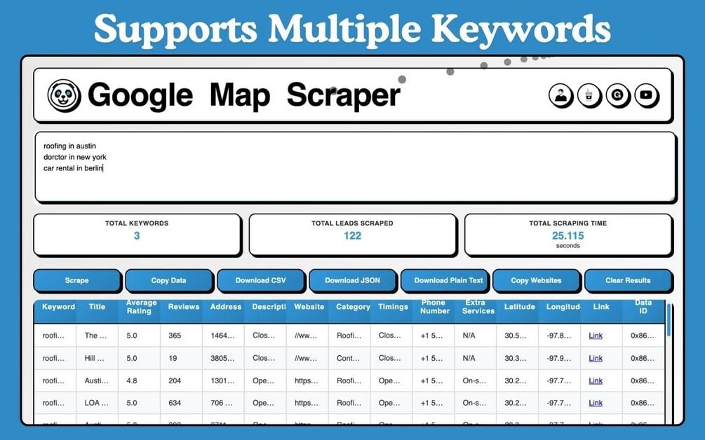 With just a few clicks, you can download the scraped data as CSV, JSON, or plain text, and easily use it for your projects. No coding required—simply enter your keywords and let the tool do the work!